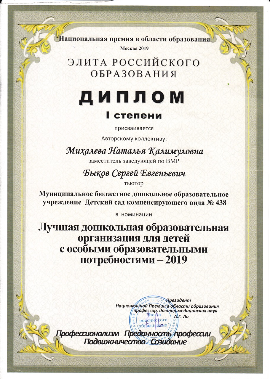 Национальная премия в области образования ЭЛИТА РОССИЙСКОГО ОБРАЗОВАНИЯ — диплом 1 степени в номинации «Лучшая дошкольная образовательная организация для детей с особыми образовательными потребностями», 2019 год
