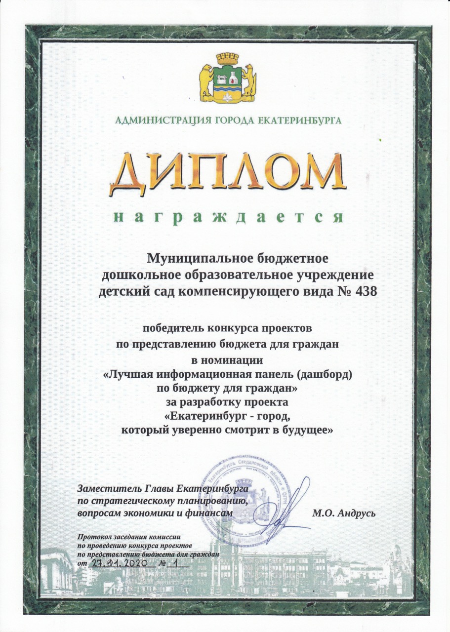 Победитель конкурса проектов по представлению бюджета для граждан в номинации «Лучшая информационная панель (дашборд) по бюджету для граждан» за разработку проекта «Екатеринбург — город, который уверенно смотрит в будущее»