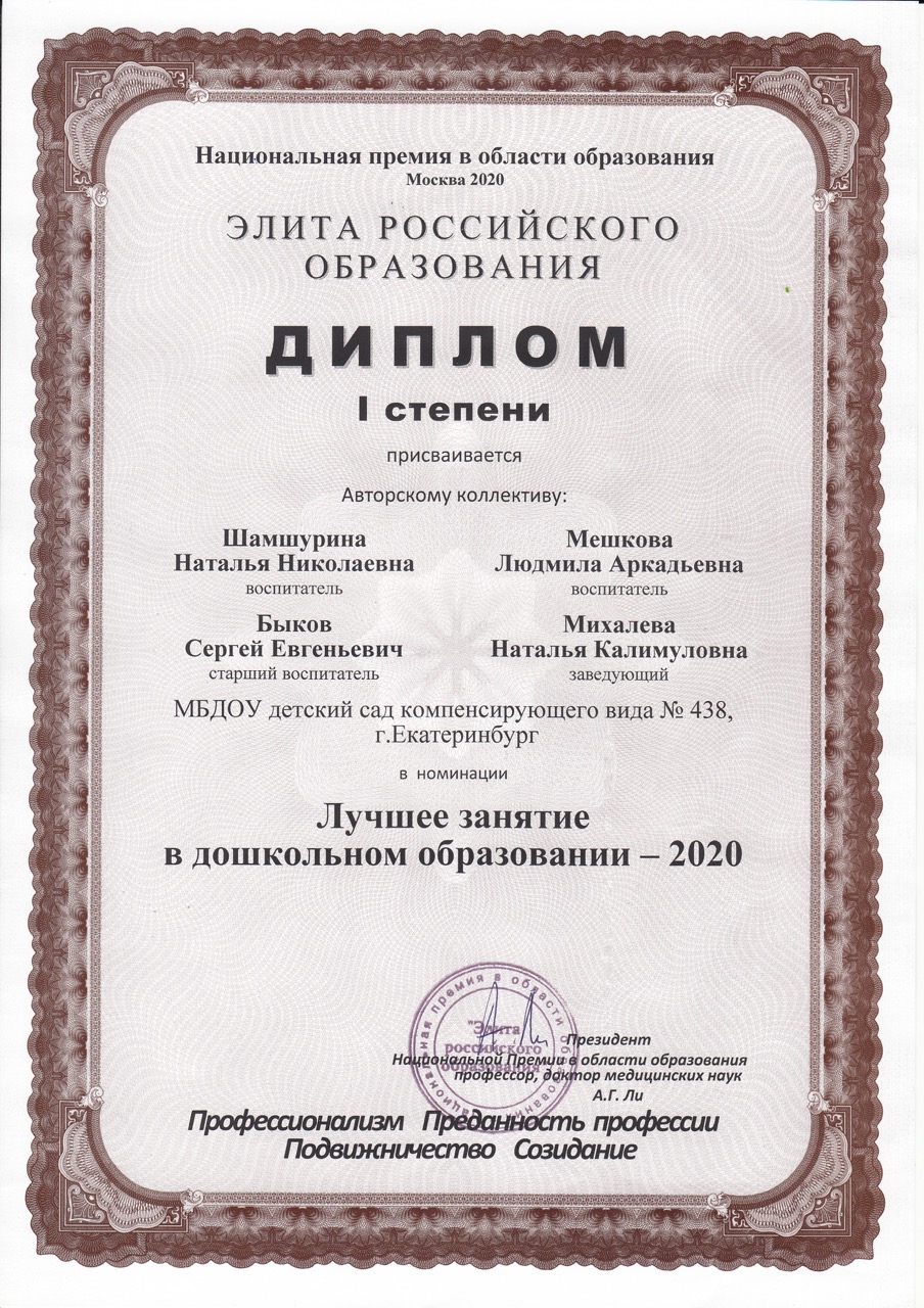 Национальная премия в области образования ЭЛИТА РОССИЙСКОГО ОБРАЗОВАНИЯ — диплом 1 степени в номинации «Лучшее занятие в дошкольном образовании», 2020 год