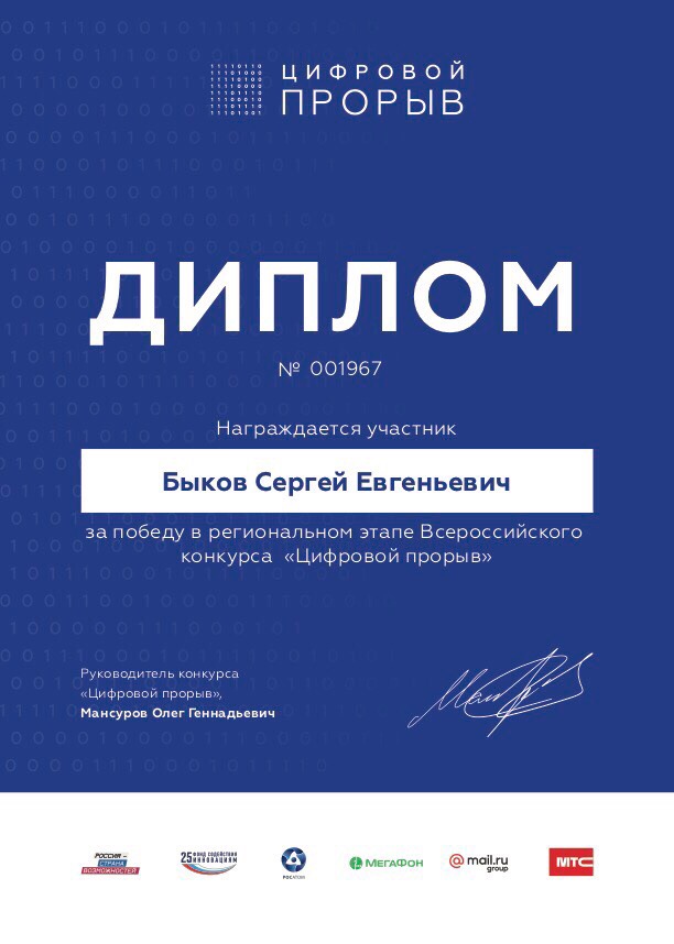 Диплом победителя в региональном этапе Всероссийского конкурса «Цифровой прорыв», 2019 год